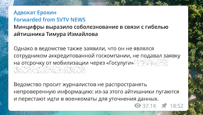 Я так понимаю про соболезнования минцифры написал как-раз прокремлевский и очень любимый российскими СМИ канал "война с фейками".