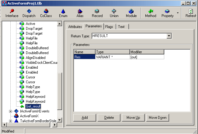 Добавим выходной параметр Res типа VARIANT*. Результат представлен на рисунке. Нажав кнопку Refresh в том же диалоге, мы обновим модуль реализации интерфейса формой ( в нашем проекте ActiveFormImpl1). Там появится заготовка для написания кода метода. Код метода очень прост: