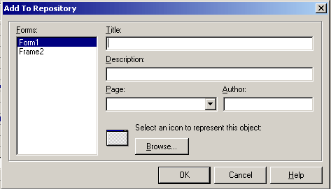 Наконец, последний способ многократно использовать формы (а так же и фреймы)– использование репозитария объектов Delphi. Репозитарий объектов – это централизованное хранилище форм, фреймов и заготовок проектов, предназначенных для повторного использования в среде Delphi. Форма, которую мы видим при выборе пункта меню File/New/Other, отображает содержимое репозитария. Добавить форму или фрейм в репозитарий не составляет никакого труда. Просто щелкните на них правой кнопкой мыши и выберите пункт меню “Add to repository”. На экран будет выведен диалог добавления.