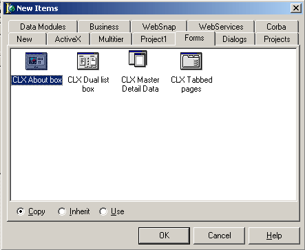 Поместить форму из репозитария объектов в проект несложно, более того, вы это фактически уже неоднократно делали – File/New/Other. Обратим внимание только на группу переключателей внизу формы: их три Copy, Inherit, Use. Copy – копирует форму из репозитария в новый модуль. Inherit – наследует класс объекта, описанного в репозитарии. Use – просто включает модуль из репозитария в текущий проект.