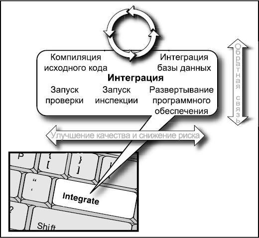 Кнопка <Integrate> (как видно на рисунке 4.1) представляет собой "автоматизированную линию сборки", которая воплощает множество практик, составляющих высокоуровневую практику CI. Автоматизированное построение представляет современную автоматизированную линию сборки, использующую "роботов" для интеграции программного обеспечения.