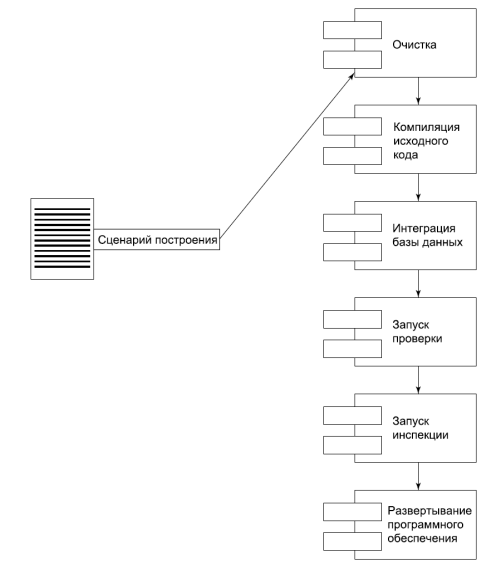 Автоматизированное построение - это как кнопка <Integrate>: нажмите кнопку, и ваше программное обеспечение будет построено (и развернуто). Это означает, что все элементы последнего будут связаны, а их функционирование проверено. Рис. 4.2 иллюстрирует действия, обычно выполняемые сценарием построения.