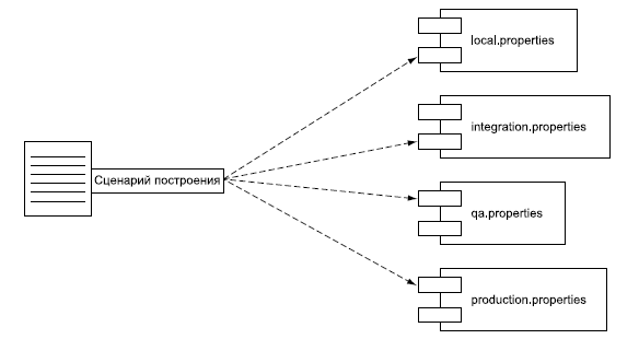 Хотя среды, в которых осуществляются тестирование или развертывание, могут различаться, сценарии построения не должны быть разными. Файлы конфигурации (типа .properties или .include) позволяют перебирать варианты без необходимости копировать и вставлять значения, подходящие для каждой среды, внутрь сценариев построения. Это еще одна область, где, как и в исходном коде, дублирование ведет к большим проблемам и снижению надежности. Для гарантии возможности создания работоспособного программного обеспечения в любой среде следует улучшить способность сценария построения к настройке за счет применения параметров. Как показано на рисунке 4.4, вы можете запускать один и тот же сценарий построения, предоставляя ему соответствующий файл свойств, настраивающий построение для каждой среды. Например, при развертывании в среде QA вы можете вызывать сценарий построения так: