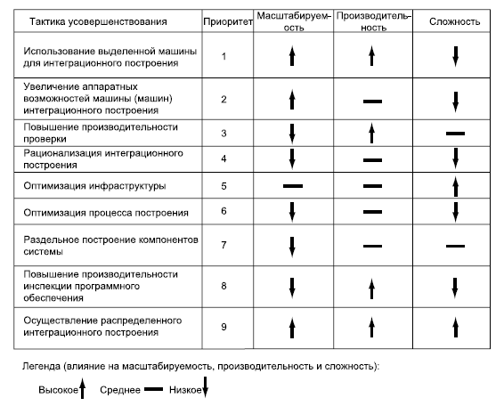 Собрав показатели, проанализируйте их, используя рисунок 4.5 как общее руководство для определения усовершенствований, которые максимально сократят продолжительность построения. Тактические приемы здесь расположены по приоритетам с использованием следующих критериев: масштабируемость, производительность и сложность реализации. Многие решения могут зависеть от размера базового кода и ряда автоматизированных процессов построения, выполнение которых требует много времени (например, автоматизированные проверки). Вы можете документировать подход, рационализировать его и применить в следующий раз, когда понадобится уменьшить продолжительность построения.