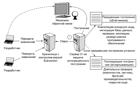 | Поэтапное построение | Применяйте облегченное "передающее" построение, осуществляющее компиляцию, юнит-тестирование и развертывание, сопровождаемое "последующим", исчерпывающим построением, которое включает проверки компонентов, системы и другие медленные проверки и инспекции |