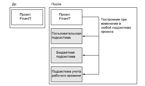 Для индивидуального построения компонентов системы создайте отдельные проекты для каждого модуля, который может быть изолирован. Это можно осуществить внутри системы CI, достаточно сделать одну из подсистем главным проектом. Если в один из проектов внесены какие-либо изменения, то на основании зависимостей другие проекты тоже перестраиваются. Рисунок 4.7 демонстрирует типичную компоновку проекта при разделении на дискретные компоненты для ускорения построения.