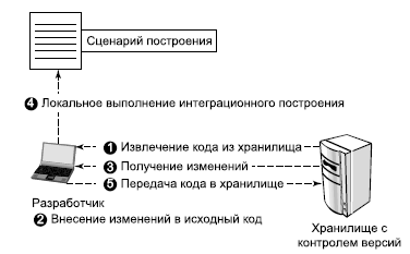 Для работы в автоматизированном режиме сервер CI нуждается в "безголовом" процессе, например в едином сценарии команды. При выполнении интеграционного построения на отдельной машине нельзя полагаться на IDE. Кроме того, для осуществления интеграционного построения единой командой необходимо получить доступ ко всем элементам программного обеспечения (из хранилища с контролем версий).