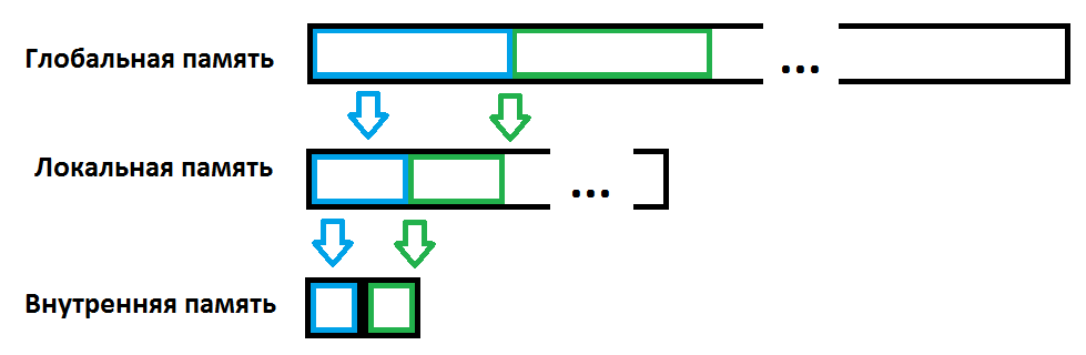 Большей информации спецификация OpenCL не дает, а для различных реализаций драйвера существуют свои оптимизации по работе с общей памятью. Например, NVidia позволяет создавать общую память в соответствии со спецификацией в OpenCL, а на платформах х86 может выделяться общая память для видеокарты и процессора, причем при выполнении функций с этим буфером, память блокируется [23]. Суммарно, работа с памятью будет выглядеть следующим образом: