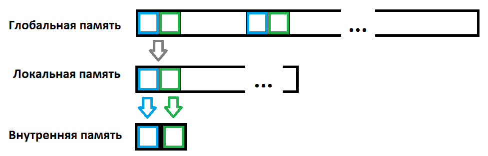 Алгоритм чтения из памяти на видеокартах NVidia работает по схеме, изображенной на рис. 3. То есть, при чтении в локальную память возникает конфликт, так как каждому ядру требуются разные блоки в памяти, удаленные друг от друга. Соответственно, если запускать обработку так, чтобы ядра в одной рабочей группе работали с близкими данными, то можно увеличить производительность за счет кеширования внутри каждой группы (см. рис. 4). Следовательно, основная цель оптимизации: снизить количество копирований из глобальной памяти в локальную.