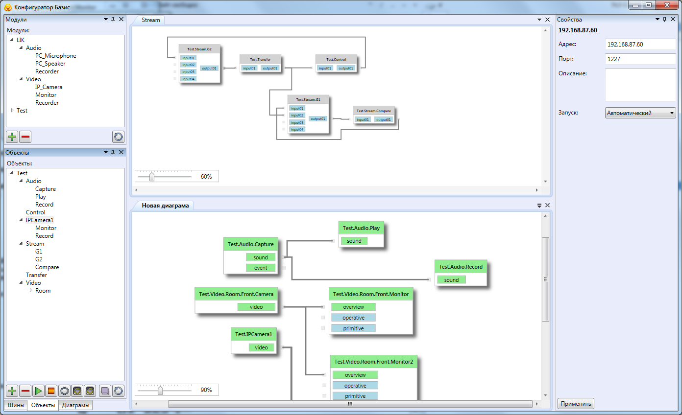 Система на платформе «Базис» строится из простых программных модулей, каждый из которых отвечает за одно простое действие. Модули могут иметь входы и выходы для подключения к другим модулям. Развертывание и управление системой осуществляется в конфигураторе «Базис» путем редактирования схемы (см. рис. 1) системы. Распределяя модули по доступным компьютерам, и соединяя их выходы и входы, администратор (или установщик) конструирует подсистемы с различным назначением, придавая системе именно ту архитектуру и функции, которые лучше подходят именно для него. Редактируя схему системы, мы можем получить систему, имеющую несколько ядер (ключевой функционал) или одно ядро, где все подсистемы находятся во взаимодействии между собой и представляют интегрированную систему.