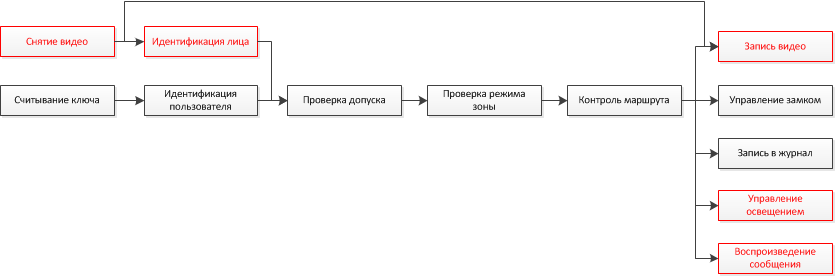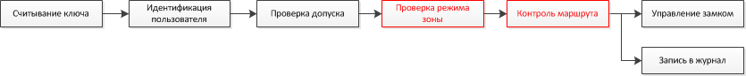 Рассмотрим вариант, когда администратору необходимо немного изменить алгоритм работы. Теперь он хочет, чтобы права доступа в зону изменялись в зависимости от того, в каком режиме она находится, например, в режиме "на охране", "снята с охраны" или "в тревоге". Вдобавок к этому, он хочет, чтобы для некоторых сотрудников и посетителей движение происходило по определенному маршруту, и все отклонения от маршрута фиксировались. Хорошо, если разработчик СКУД предусмотрел такие варианты, если нет – изменить алгоритм работы будет невозможно никакими модулями расширения и никакими настройками. При использовании «Базис» эта и другие подобные ситуации разрешаются очень просто. На рисунке 3 показана схема измененной системы, добавленные модули отмечены красным. При таком изменении система проходит испытание на гибкость.