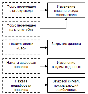 Если вспомнить, что такое конечный автомат и сравнить с тем, что происходит во время взаимодействия с пользователем, то можно понять, что в этих двух сущностях достаточно много общего. За состояния можно принять состояние интерфейса (нажата или отпущена кнопка, поставлен флажок или нет, выбрана первая закладка или вторая, и так далее), пользовательские события могут запускать автомат. Например, на рис. 1 представлен граф переходов автомата обычного диалогового окна ввода при вводе числа (рисунок 2). Пунктиром представлены события, сплошными линиями – состояния автомата. Для краткости и наглядности в данном примере в качестве «названий» состояний автомата взяты действия, выполняемые автоматом в данном состоянии.
