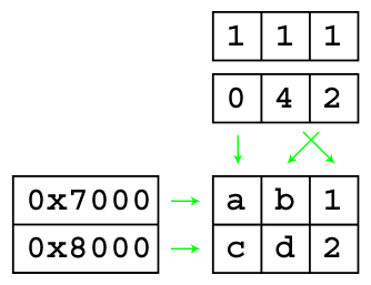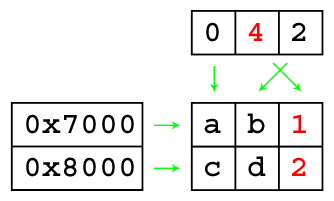 Хоть это и не принципиально, но при таком подходе мы вдобавок избавились от операции умножения для получения индекса, что происходит при обычном двумерном массиве: чтобы в массиве NxM получить элемент [i, j] нужно обратиться по адресу Массив[(i * КоличествоСтолбцов + j) * РазмерЭлемента]. Адрес строки занимает 4 байта, а элемент массива может быть любого размера, так что мы не только минимизировали количество сдвигов, но и при размере элемента больше 4-х байт, уменьшили количество обращений к памяти. А так же мы получили возможность менять строки местами всего лишь поменяв базовые адреса строк местами. |