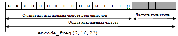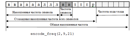 Накопленная частота символа есть суммарная частота всех символов, пришедших на кодирование до этого символа. Суммарная накопленная частота – это сумма частот всех уже закодированных символов.