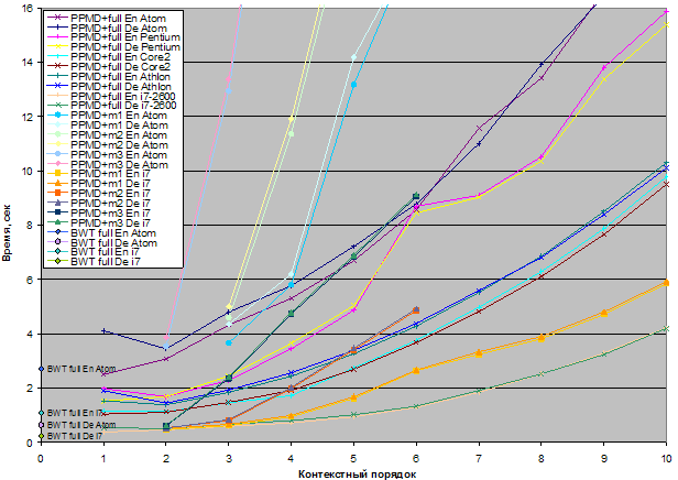 Согласно графикам, представленным на этом рисунке, время обработки информации кодеками РРМ стремительно возрастает при увеличении порядка контекстной модели. На графиках хорошо заметно, что скорость декомпрессии для кодеков на базе РРМ уступает скорости компрессии от 5 до 20%. Время работы кодеков PPMD+mem1, PPMD+mem2 и PPMD+mem3, использующих контейнеры с фиксированным числом записей, больше, чем у кодеков без таких ограничений. Особенно это заметно на больших порядках, когда время обработки данных этими кодеками возрастает линейно. Такое поведение этих кодеков связано с работой механизма удаления записей, который включается при переполнении контейнеров.