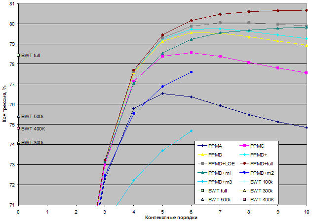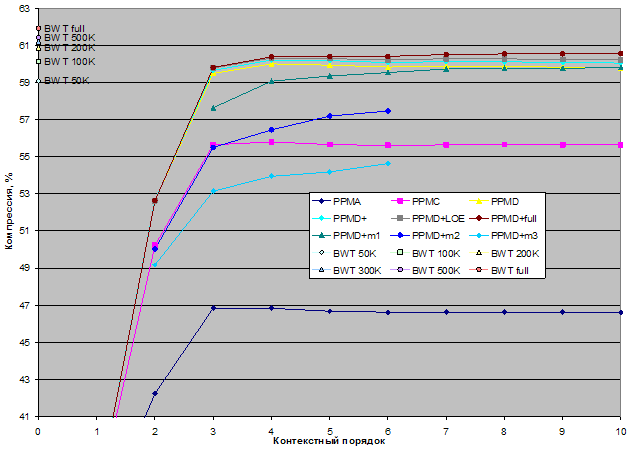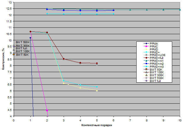 Ближайшим лучшим кодеком на базе алгоритма РРМ для теста ACT GRAPHICS является PPMD+full o10 с результатом 3.156 (60.548%), что ненамного хуже, чем BWT full.