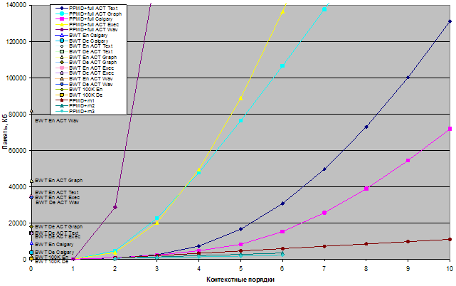 По рисунку видно, что для РРМ-кодеков размеры заказываемой памяти существенно зависят как от типа сжимаемой информации, так и от порядка контекстной модели. Использование РРМ-кодеков с ограничениями размеров памяти решает эту проблему. Кодеки PPМD+mem1, PPМD+mem2 и PPМD+mem3 требуют гораздо меньше памяти для компрессии и декомпрессии, чем другие РРМ-кодеки, а их потребности в памяти не зависят от типа кодируемой информации. Кроме этого, заказ памяти у них увеличивается линейно с увеличением порядка модели, а не экспоненциально, как у других РРМ-кодеков.