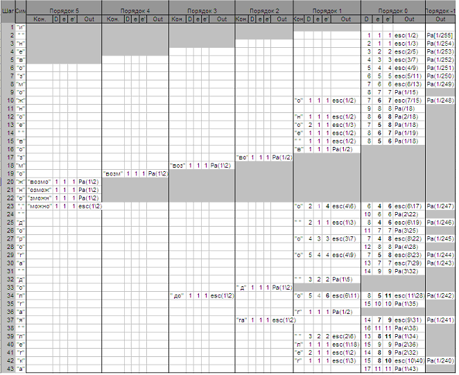 В Таблице 1 показано кодирование по шагам для каждого символа исходного текста. Серым цветом закрашены порядки, которые исключаются из обновления после кодирования очередного символа. В поле «Кон.» указывается текущий контекст, в поле «D» – число различных символов, встретившихся в текущем контексте. В полях «e» и «e'» даются значения частоты кода ухода, вычисленные по методу D и D+ соответственно. В поле «Out» сообщается о том, что было подано на частотный кодировщик: если «esc», то была передана вероятность кода ухода, а если «Pa» – вероятность символа. В скобках указывается вероятность передачи кода ухода или символа как отношение их частот к общей накопленной частоте.
