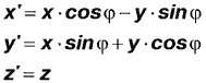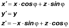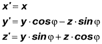 Первым этапом построения изображения треугольной грани будет определение координат ее вершин в мировой СК и, в частности, их положения на экране, для чего требуется повернуть СК модели на заранее заданные углы (см. выше). Наиболее изящно такой поворот осуществляется умножением радиуса-вектора вершины на матрицу поворота. Мы же опишем его в терминах обычной координатной геометрии с применением формул поворота «плоской» (!) СК. Пусть x, y, z – начальные, а x’, y’, z’ - конечные координаты вершины, ТАУ – угол поворота, тогда эти формулы приобретают вид: