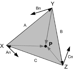Внимательный читатель заметит, что на предыдущем этапе задачу о взаимном расположении точки и треугольника мы решали в плоскости экрана и ни для одной из проверяемых точек координата z вообще неизвестна. Зато известны координаты z вершин треугольной грани, а кроме того, тот очевидный факт, что любая из точек (пусть это будет все та же точка P на рисунке вверху) лежит в плоскости грани. Следовательно, векторы A, C, XP (можно выбрать и другие тройки) компланарны и