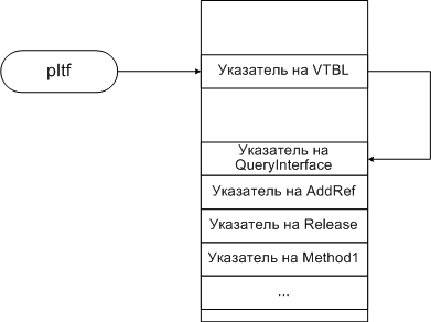 Работа с любым интерфейсом осуществляется через указатель на этот интерфейс. Физически указатель на интерфейс – это указатель на переменную, которая, в свою очередь, указывает на таблицу указателей на методы этого интерфейса (VTBL, см. рисунок 1).