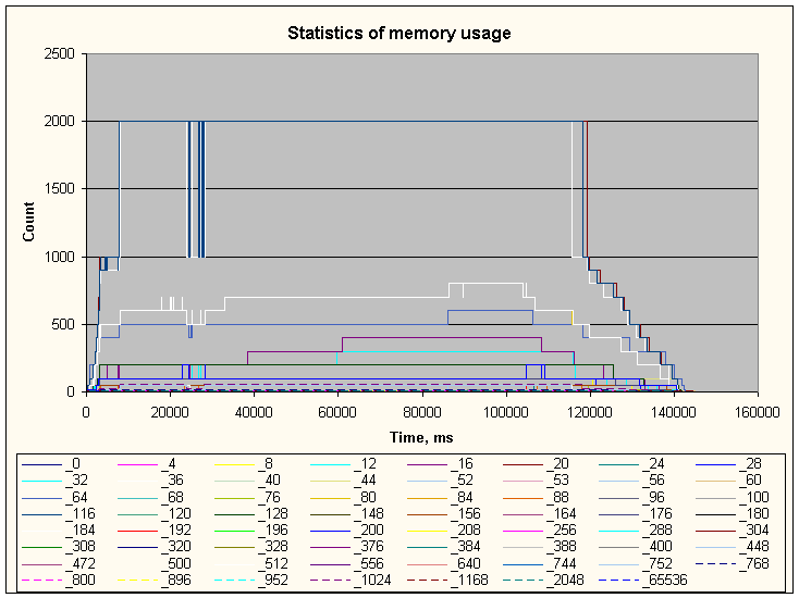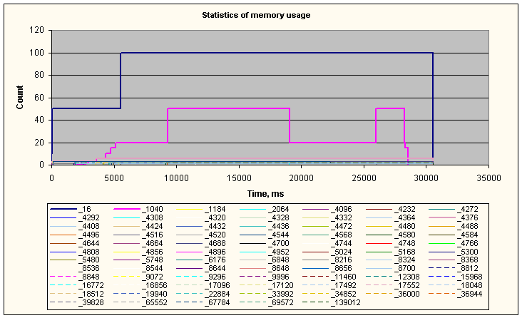 После этого начнут отслеживаться не обращения программы к Quick Heap, а реальные занятия и освобождения памяти в heap процесса. Чтобы вернуться к контролю за обращениями к Quick Heap (то есть вновь получить графики, представленные на рис.1), достаточно закомментировать объявление ASC_MEM_STATISTIC_USE_QUICK_HEAP.