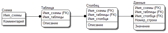 УМД состоит из фиксированного набора таблиц. Она может хранить в себе и данные, и метаданные нескольких виртуальных схем базы. В простейшем варианте УМД представляет собой набор из четырех таблиц изображённый на рис.1.