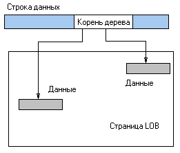 В качестве структуры хранения данных используется B-tree. В строке данных хранится 16-байтный указатель на корень дерева – структуру размером 84 байта. Если размер данных не превышает 32 Кб, в корневой структуре хранятся ссылки на блоки данных, расположенных на этой же или других страницах. Большие объекты хранятся на специальных страницах, на которых нельзя размещать никакие другие данные, кроме image, text и ntext. Однако данные этих типов из разных таблиц могут быть размещены на одной странице. Если общий размер данных не больше 64 байт, все данные сохраняются в корневой структуре.