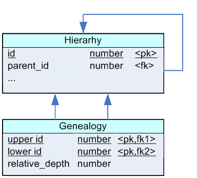 Теперь рассмотрим случай, когда иерархия не статична. Предлагаемый способ навигации по изменчивым иерархиям требует построения транзитивного замыкания отношения родитель-потомок. Практически это реализуется следующим образом. Добавляется новое отношение с атрибутами upper_id, lower_id, relative_depth, которое содержит все прямые генеалогические отношения (в т.ч. родитель – потомок, родитель родителя – потомок, родитель родителя родителя – потомок, и т.д.). Если в соответствующей таблице сделать нужные индексы, появляется возможность быстрой выборки как любых родителей, так и любых потомков (в т.ч. послойно).