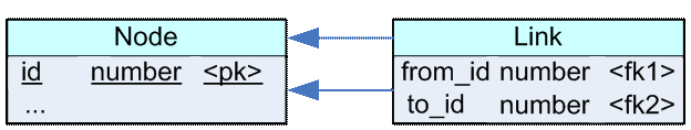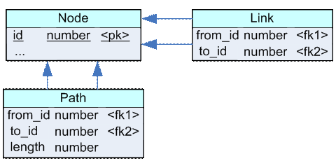На рисунке 4 показан вариант такой оптимизации. Вдобавок к таблице Node, содержащей атрибуты узла, и таблице Link, содержащей ребра сети, вводится таблица Path, которая содержит пути из узла в узел. В таблице Path атрибут from_id указывает на исходный узел сети, атрибут to_id – конечный узел сети, а атрибут length – на длину пути.