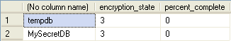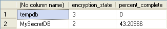 SELECT DB_NAME(database_id), encryption_state, percent_complete FROM sys.dm_database_encryption_keys |