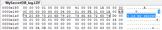 Напомню, что сами секретные данные были сброшены в резервную копию журнала транзакций уже после того, как база данных была зашифрована и восстановлена без всякого доступа к ключу. На самом деле для того чтобы увидеть секретные данные, в нашем случае достаточно было открыть в редакторе файл журнала транзакций (или его резервную копию). Несмотря на то, что наша база зашифрована, секретные данные в журнале транзакций остались в открытом виде (шифруются только новые транзакции).