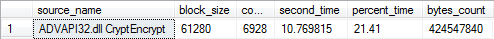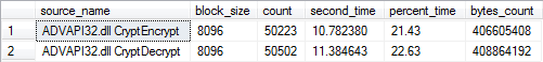 Шаг 5. Снова запускаем ту же тестовую процедуру, но уже для зашифрованной базы данных. Процедура возвращает нам общее время выполнения теста и потребление времени CPU. C помощью SQLInternalsProfiler'а мы так же получаем список API-функций из динамической библиотеки ADVAPI32.DLL (все основные криптографические функции реализованы именно в этой библиотеке), выполнение которых заняло значительное время (> 0.5%). По каждой функции выводится общее время выполнения и количество сделанных вызовов.