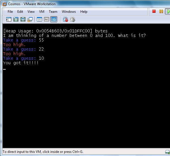 В настоящее время проект находится на самой ранней стадии развития. Авторы работают над поддержкой широкого диапазона файловых систем, включая FAT и ext2. Тем не менее, в будущем нам обещаны графика, локальные сети и другие возможности, присущие полноценной ОС. По адресу http://www.codeproject.com/KB/system/CosmosIntro.aspx можно найти статью, рассказывающую об основах разработки и отладки ОС с использованием Cosmos.