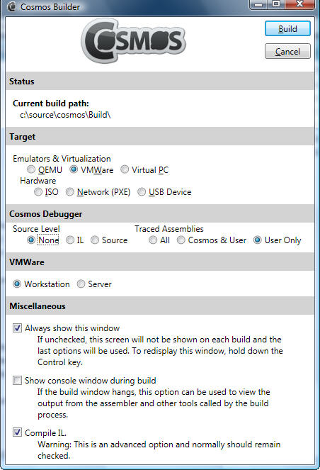 Cosmos (как и Windows CE) не является операционной системой в традиционном значении этого термина; вместо этого он представляет собой некий «конструктор», позволяющий разработчику с легкостью создать свою собственную ОС; утверждается, что ее разработка и загрузка займут, в простейшем случае, всего несколько минут. J Вот как выглядит инструмент Cosmos Builder, предназначенный для сборки загрузочного образа ОС: