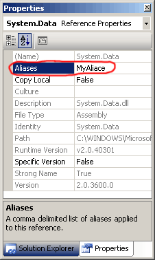 В новой версии VS появилась возможность задавать алиасы для сборок. При подключении ссылки на сборку для нее можно задать алиас (альтернативное имя). Это позволяет избегать конфликтов имен и использовать в одном проекте ссылки на разные версии одной и той же сборки. Сам алиас задается или в параметре reference: