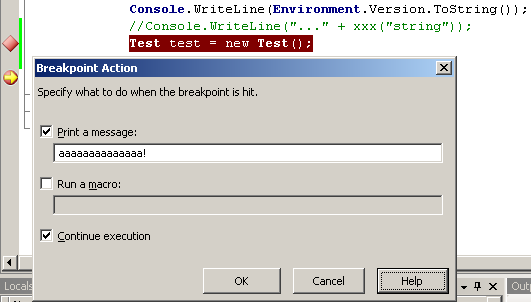 Теперь точка останова может вызывать макрос или выводить некоторое сообщение в окно output. При этом самой остановки выполнения программы можно не производить. Получаются эдакие точки остановки без остановки. На рисунке 14 показан диалог, позволяющий задать действия. Как видите, имя макроса пока что приходится задавать вручную. Будем надеяться, что к релизу его можно будет выбирать из списка.