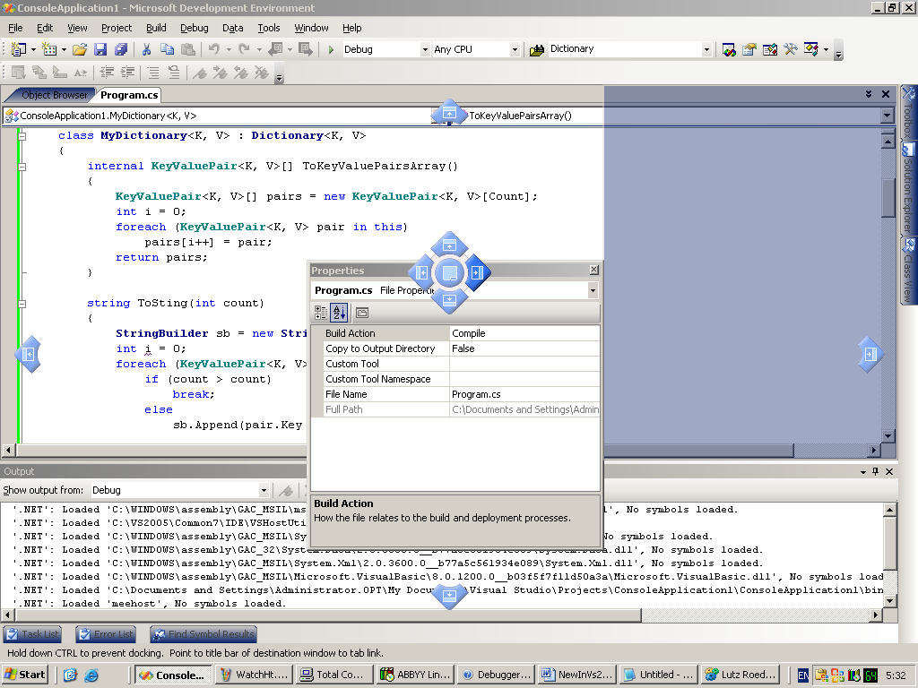 В прошлой статье я рассказывал о том, что в VS появилась возможность вставки шаблонных участков кода (code snippet). Я тогда сказал, что эта возможность расширяема, но посетовал, что не смог найти, как это делается. Так вот теперь точно стало известно, что они будут расширяться, так как появился пункт «My code snippets». Нашлось место, где должны лежать предопределенные шаблоны. Они лежат в каталоге VS2005\VC#\Expansions\1033\Expansions\. VS2005 – это каталог, в который установлена Visual Studio.