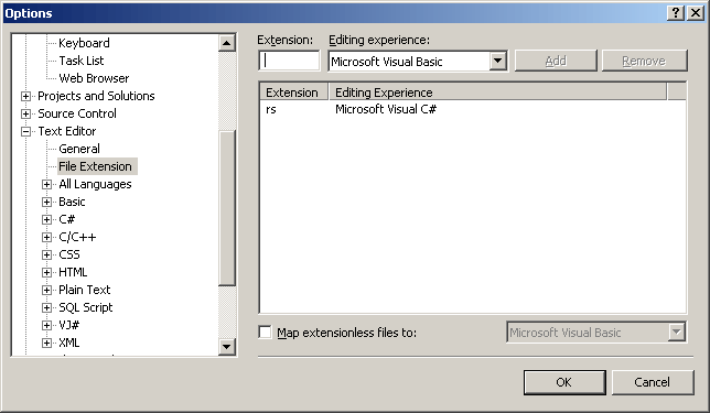 В VS 2005 появилась настройка ассоциации расширений с имеющимися редакторами и дизайнерами. Эта настройка доступна в диалоге Options в ветке Text Editor\File Extension (см рисунок 3).