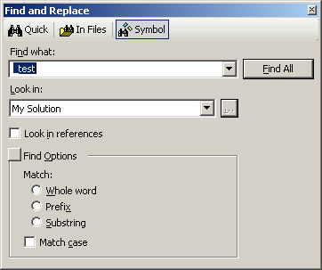 Find symbol – это новая замечательная возможность, появившаяся в VS. Суть ее очень проста. Она позволяет найти некоторое имя в программе. При этом поиск можно производить в исходниках проекта и сборках (как тех, на которые ссылается проект, так и любых других, включая системные). Эта возможность доступна в окне поиска, вызываемом по Ctrl+F (см. рисунок 9).