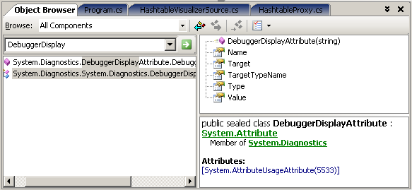 Если атрибут применяется глобально, то, как и в предыдущих случаях, он и все, что с ним связано, должно быть помещено в отдельную сборку. Эту сборку после компиляции нужно скопировать в каталог «C:\VS2005\Common7\Packages\Debugger\attribcache\».