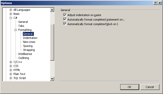 В предыдущей версии Whidbey все настройки форматирования были помещены в один огромный список. Найти нужную при этом было очень не просто. Теперь количество настроек несколько уменьшили, и, что очень важно, настройки разбили на разделы (поместив их в подветки). На рисунке 2 изображен диалог настройки форматирования кода. Как видите, настройки форматирования разбиты на Indentation (отступы), New lines (перевод строк), Spacing (вставка пробельных символов), Wrapping (перенос конструкций на другую строку).