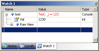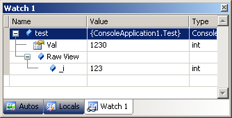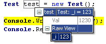 [DebuggerTypeProxy(typeof(TestProxy))] class Test { public int _i = 123; } class TestProxy { Test _test; public TestProxy(Test test) { _test = test; } public int Val { get { return _test._i * 10; } } } |