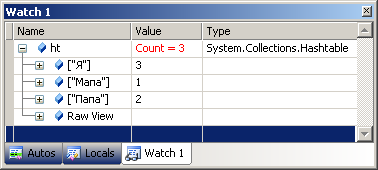 На момент написания этой статьи в .NET Framework прокси были созданы для ArrayList, HashTable, KeyedCollecton, Queue, SortedListStack. Это позволяет видеть более удобоваримое представление экземпляров этих классов в отладчике. Например, хэш-таблица, заполненная следующим образом: