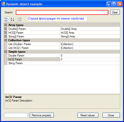 В тестовом проекте вы также найдете пример реализации фильтра свойств oбъекта DynamicObject, отображаемых в элементе управления PropertyGrid. Идея была мной позаимствована из новой WPF-версии элемента управления PropertyGrid, использованного в Visual Studio 2008. Подробно останавливаться на этом я не буду. Скажу просто, что если объект DynamicObject имеет более 20-30 свойств, очень удобно иметь возможность отфильтровать свойства по имени.
