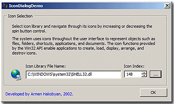 До этого дня я пребывал в уверенности, что если это и не реализовано в MFC или ATL в виде класса стандартных диалогов, то точно есть какая-либо Windows API функция, которая решит эту проблему. Представьте себе мое удивление, когда, обыскав весь MSDN, я не обнаружил никакого упоминания об этом. Перейдя на поиск в The CodeProject (где опубликован оригинал этой статьи), я случайно натолкнулся на статью Хэнка Девоса, и оказалось, что Microsoft не документировала эту API функцию. Она реализована в Shell32.dll под порядковым номером 62, и, соответсвенно, ее можно использовать, динамически загрузив эту библиотеку. Так как мой Мастер был написан с помощью MFC, то я написал класс CIconDialog наподобие стандартных классов MFC (CColorDialog и т.д.) на базе этой функции. Ее подробное описание можно найти по предпоследней ссылке выше.