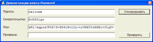 Один из вариантов реализации схемы хэширования с синхропосылкой предлагается вашему вниманию в виде класса Password. Ниже приводится краткое описание свойств и методов этого класса, а затем приводится несколько типичных вариантов его использования.
