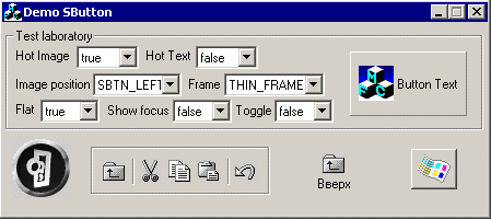 Класс SButton позволит вам снабдить программу кнопками, содержащими и картинки, и текст. Вы сможете установить для кнопки целый ряд различных стилей. Кроме того, класс SButton может самостоятельно построить по заданному цветному изображению чёрно-белое, которое будет использоваться, когда кнопка не в фокусе.