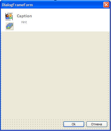 Примем, что у окна есть рамка – это окно-контейнер, вмещающий в себя окно-информационную панель. Рамка может содержать заголовок (header) и нижний колонтитул (footer). Как правило, в заголовке помещается какая-либо информация касательно смысла самого диалогового окна, а в нижней части окна обычно располагаются кнопки «Ok» и «Отмена». Информационная панель в свою очередь представляется диалоговой панелью, т.е. окном, имеющим лишь клиентскую область. Для VCL свойство формы BorderStyle следует установить в bsNone.