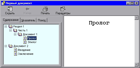 first и second – это псевдонимы файлов, составляющих нашу коллекцию, по ним программа просмотра HTMLHELP получит из hhcolreg.dat полные пути и имена chm-файлов коллекции. Для упрощения реализации процесса регистрации принято, что эти псевдонимы должны совпадать с именами соответствующих chm-файлов, находящихся в одном каталоге с файлом коллекции, хотя в общем случае это не обязательно. “Раздел 1” и “Часть 1” – просто названия (на что указывает отсутствие знака ‘=’ ) дополнительных папочек, внутрь которой будет помещено содержимое first.chm.